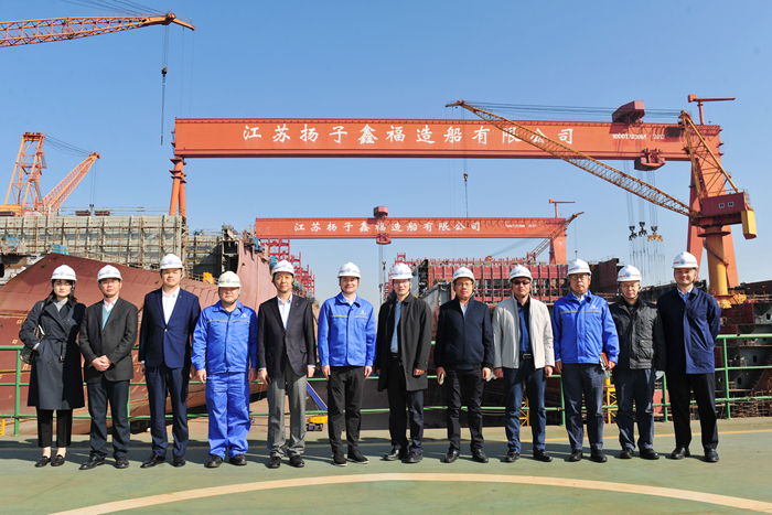 董事長(zhǎng)任樂天、副總經(jīng)理張濤陪同胡賢甫總經(jīng)理一行參觀了揚(yáng)子鑫福造船生產(chǎn)現(xiàn)場(chǎng),任董詳細(xì)介紹了揚(yáng)子江船業(yè)的發(fā)展歷程和當(dāng)前的經(jīng)營(yíng)形勢(shì)。登上揚(yáng)子鑫福塢門,揚(yáng)子鑫??偨?jīng)理?xiàng)钛檎猩叹止I(yè)一行領(lǐng)導(dǎo)介紹了塢內(nèi)在建船舶的基本情況和建造進(jìn)度。