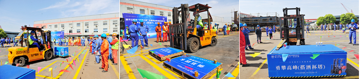 啟動儀式后,來自新?lián)P子造船9個車間/部門舉薦的18名叉車工參加了首場技能競賽。叉車工競賽項目為勇闖四關(guān)。四關(guān)是指實干篤行(過S彎道)、強基固本(巧碼貨盤)、專業(yè)精進(jìn)(寬物進(jìn)窄門)、勇攀高峰(搭酒杯塔),項目是對參賽選手綜合能力的考驗,要求做到“快、巧、準(zhǔn)、穩(wěn)”,即快速通過障礙、叉運寬物進(jìn)窄門、精準(zhǔn)堆放貨盤、平穩(wěn)搭建杯塔。