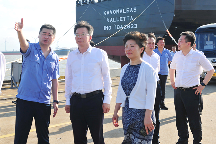 調(diào)研中,李忠軍副省長(zhǎng)一行深入公司生產(chǎn)一線,只見一艘艘成型的新船正在水下作舾裝調(diào)試,船塢內(nèi)各類船舶正在加緊建造,一派繁忙的船舶建造場(chǎng)景。在座談會(huì)上,李忠軍副省長(zhǎng)詳細(xì)了解我司運(yùn)行情況,詢問地緣政治、貿(mào)易戰(zhàn)等帶來的影響、未來航運(yùn)市場(chǎng)變化分析以及企業(yè)的應(yīng)對(duì)舉措,勉勵(lì)企業(yè)按照新質(zhì)生產(chǎn)力發(fā)展要求,加快高端化、智能化、綠色化步伐,加快智改數(shù)轉(zhuǎn)網(wǎng)聯(lián),不斷提升船舶研發(fā)能力和建造水平,進(jìn)一步增強(qiáng)江蘇高技術(shù)船舶與海工裝備先進(jìn)制造業(yè)集群的國(guó)際競(jìng)爭(zhēng)力。