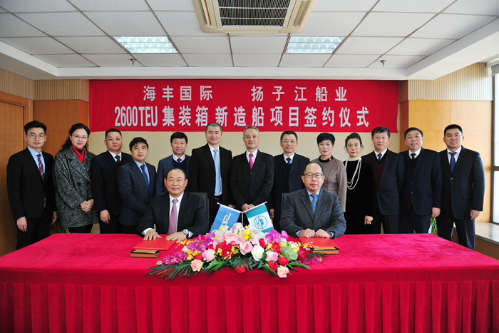 我集團與海豐國際本年度第三次合作,12月19日,雙方共同簽署6+2+2艘2600TEU集裝箱新造船建造合同。集團董事長任樂天先生,集團副總經理杜成忠先生、張濤先生,海豐國際董事局副主席兼首席執(zhí)行官楊現(xiàn)祥先生攜夫人,海豐航運集團副總裁肖森元先生,上海海事大學校長陸靖先生,上海海事大學商船學院黨委書記曹紅奮女士,上海海事大學商船學院院長肖英杰先生,上海船舶研究設計院院長呂智勇先生等共同見證新訂單成功簽約。