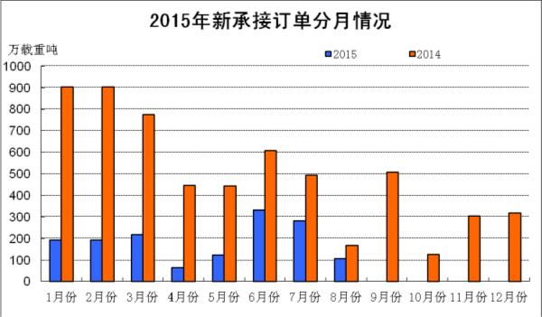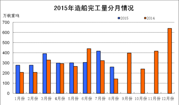 2015年1~8月,船舶工業(yè)經(jīng)濟運行總體保持平穩(wěn),造船完工量同比增長,受國際船舶市場低迷的影響,新承接船舶訂單、手持船舶訂單同比下降,新船價格低位震蕩,企業(yè)經(jīng)濟效益略有下降。