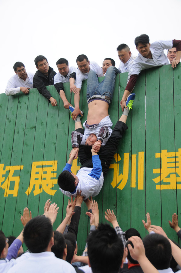 下午的拓展項(xiàng)目更是“體驗(yàn)升級(jí)”,“卓越圈”項(xiàng)目讓人意識(shí)到從優(yōu)秀到卓越不是一蹴而就的,是一個(gè)曲折的過(guò)程,是一個(gè)不斷超越的過(guò)程,在一輪一輪挑戰(zhàn)5.4秒這個(gè)終極時(shí)限的過(guò)程中,我們的年輕干部們磨傷了手、劃傷了臉、蹲酸了腿,任灰塵在身邊沸騰,任汗水在臉上流淌,他們都沒有退縮一步,不斷的嘗試、改進(jìn)、再嘗試、再改進(jìn),最終,5.21秒這個(gè)卓越的成績(jī)被記錄在了成績(jī)冊(cè)上,大家歡呼雀躍。到了最后的挑戰(zhàn)了,“畢業(yè)墻”垂直立于地面,沒有輔助設(shè)施,沒有輔助人員,大伙兒覺得需要1.5小時(shí)這47名學(xué)員才能全部翻過(guò)這面墻——4.2米高的墻。按照教練的指導(dǎo),做基礎(chǔ)的、做輔助的、做保護(hù)的、做拉手的,自發(fā)輪流上陣,伙伴們一個(gè)一個(gè)互相拉扯著翻越了畢業(yè)墻,他們中有人肩膀被踩破了,有的肌肉僵硬了,有的手臂勒紫了,但都沒有吭一聲,只想著讓所有的伙伴全都快速翻過(guò)墻,堅(jiān)持不懈的精神在他們中不斷傳遞著……終于他們創(chuàng)造了一個(gè)自己都沒敢想的奇跡,15分49秒51,所有47人全部完成了翻越!
