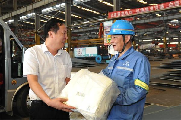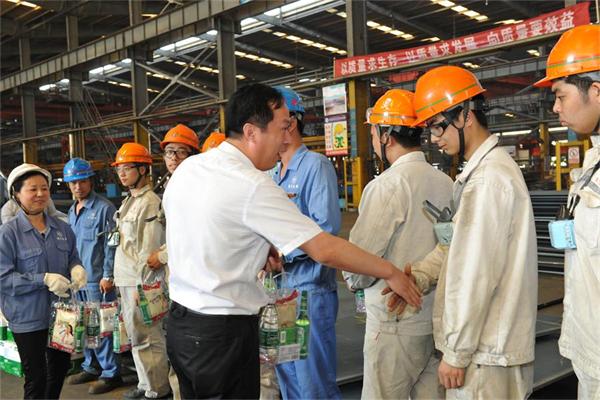 胡榮華副主席帶隊(duì)慰問了在高溫下堅(jiān)守工作崗位的新?lián)P子加工車間員工,給他們送去防暑降溫物品,他代表市委、市政府向頂著烈日奮戰(zhàn)在一線的全體工友表示慰問。之后,市總領(lǐng)導(dǎo)一行還對(duì)我集團(tuán)上半年度工會(huì)工作進(jìn)行了調(diào)研。在聽取工會(huì)王主席對(duì)我司上半年主要的工會(huì)工作和職工活動(dòng)介紹后,胡副主席用“四個(gè)有”評(píng)價(jià)了我們的工作,即“企業(yè)發(fā)展有條不紊、工會(huì)工作井井有條、活動(dòng)開展有聲有色、服務(wù)職工有心有愛”當(dāng)天,市總共為我們送來(lái)了400條毛巾和5箱礦泉水的慰問品。