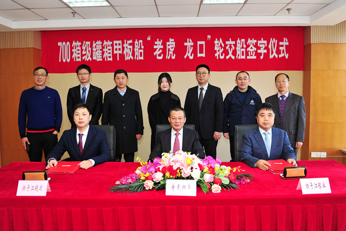 1月6日,我集團(tuán)與老虎燃?xì)饴?lián)合研發(fā),由新?lián)P子造船建造的集團(tuán)首制700箱級(jí)罐箱甲板船“TIGER LONGKOU”輪順利交付。老虎燃?xì)舛麻L(zhǎng)薛朝春先生,我集團(tuán)副總經(jīng)理杜成忠先生,揚(yáng)子江航運(yùn)公司財(cái)務(wù)總監(jiān)孫劍平先生分別代表各方簽署交船文件。老虎燃?xì)猓ㄉ虾#┯邢薰究偛迷S俊峰先生,中船動(dòng)力副總經(jīng)理張仲領(lǐng)先生,我集團(tuán)總經(jīng)理助理吉宏飛先生以及中國(guó)船級(jí)社駐廠辦等多方嘉賓共同見(jiàn)證新船交付。