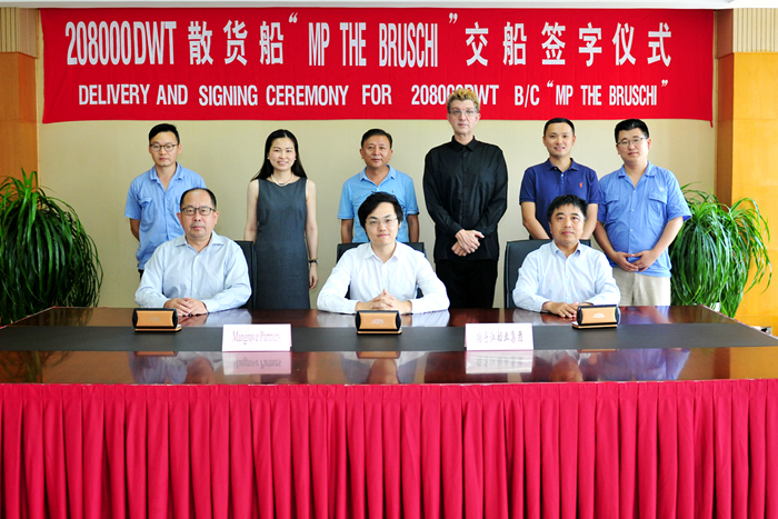 Mangrove Partners船東代表黃子軒律師,建信金融租賃代表嚴(yán)歡律師,船東現(xiàn)場(chǎng)辦經(jīng)理Mr.Tudor和副經(jīng)理劉勝忠先生,克拉克森上海分公司新造船項(xiàng)目經(jīng)理朱宏巍先生,以及我集團(tuán)副總經(jīng)理杜成忠先生、副總經(jīng)理張濤先生等共同見證了“MP THE BRUSCHI”輪簽字交付。