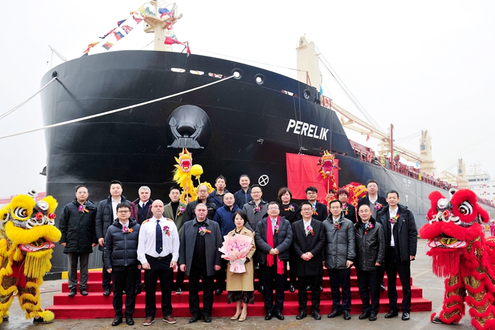 命名人郁紅女士將新船命名為 “PERELIK”(佩雷利克)輪,并為新船敲香檳祈福。她祝福新船揚帆遠航、載譽全球,祝愿隨船船員乘風破浪、一路平安,開辟遠航新篇章。按照船東公司以保加利亞山脈和山峰為新船命名的慣例, “PERELIK”輪船名取自位于羅多普山脈的一座山峰。