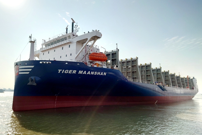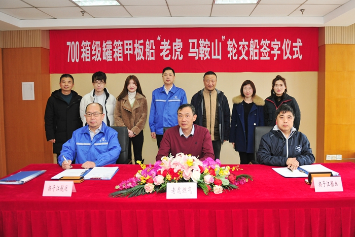 2月14日,我集團(tuán)與老虎燃?xì)饴?lián)合研發(fā),由新?lián)P子造船建造的集團(tuán)第二艘700箱級(jí)罐箱甲板船“TIGER MAANSHAN”輪順利交付。