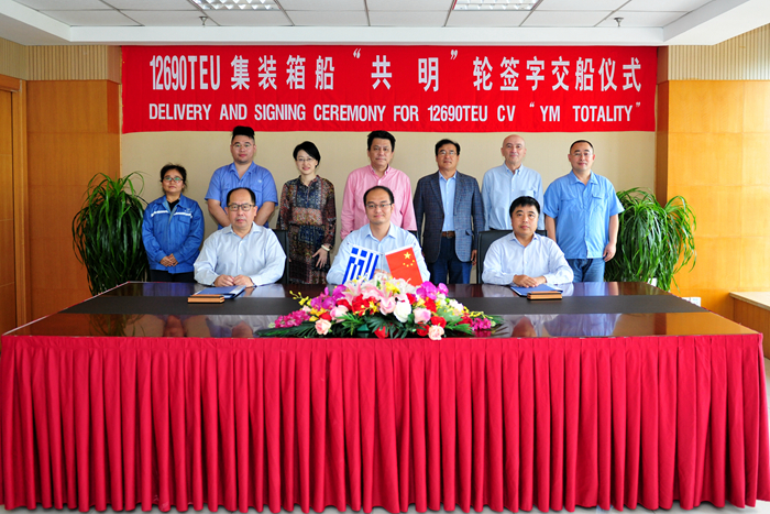 9月25日,我集團(tuán)為希臘船東COSTAMARE建造的第三艘12690TEU集裝箱船“YM TOTALITY”(共明)輪順利交付。交銀租賃公司航運(yùn)租賃部總輪機(jī)長(zhǎng)梁苗先生、航運(yùn)租賃部高級(jí)經(jīng)理徐鑫先生,監(jiān)造公司W(wǎng)atermark運(yùn)營(yíng)總監(jiān)Mr.Panos Christidis、監(jiān)造組組長(zhǎng)南相福先生,船東律師張琳女士,以及我集團(tuán)副總經(jīng)理杜成忠先生、張濤先生、我集團(tuán)新?lián)P子造船副總經(jīng)理吉宏飛先生等領(lǐng)導(dǎo)和相關(guān)工作人員共同見證了新船交付。