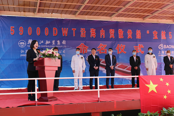 4月8日上午8點58分,教母陳照娣女士、寶鋼航運船舶技術部經理秦榮玉先生、船舶技術部機務主管董彬先生、中國船級社驗船師麻天一先生、上海雙希海事發(fā)展有限公司船舶監(jiān)理部總監(jiān)孔正先生及監(jiān)造組、揚子江集團副總經理宋書明先生及其他公司領導參加了命名儀式。教母陳照娣女士為本船命名,并為新船砍纜祈福。“寶航56“輪是我集團為上海寶鋼航運有限公司建造的首制船,建造過程中船東、船級社、監(jiān)造組及船廠等多方團結一心,克服了限電、新冠疫情等困難,僅用9個月即高品質地完成了本船建造,充分體現了揚子江速度。
