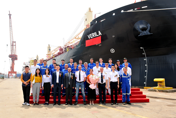 保加利亞NAVIBULGAR航運公司現(xiàn)場辦經(jīng)理Nikolay Nikolov先生代表船東方感謝了揚船人克服疫情影響,堅持連續(xù)生產(chǎn),履行合同承諾按期保質(zhì)交船。也向在項目建造期間,密切協(xié)作的融資方、承保方、船級社等各方表達(dá)了謝意。周黎黎女士將新船命名為“VERILA”輪,并為新船剪彩、擲香檳,為新船及隨行船員祈福祝愿。