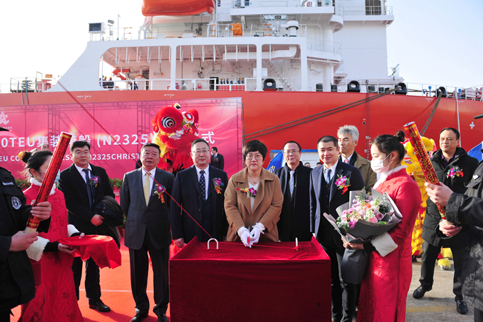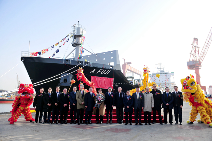 元月12日上午,我集團與上井物流相聚揚子江,共同舉行一艘1800TEU集裝箱船命名儀式。新船命名人李新霞女士,上井物流董事長原文濤先生,上井物流董事原文海先生,海興航運董事長孫興濤先生和來自上海船舶研究設計院、LR船級社、NK船級社、ABS船級社代表以及我集團董事長任樂天先生、集團副總經理杜成忠先生、副總經理張濤先生等相關領導和嘉賓出席了儀式。命名儀式由我集團副總經理張濤先生主持。命名人李新霞女士將新船命名為“A FUJI”(富士山)輪并為新船砍纜祈福,她拉響汽笛,祝福新船在未來的航程中,乘風破浪,航行順利,順達貨滿,船員平安啟歸。