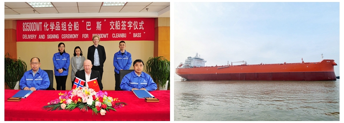 “BASS”輪是我司為挪威KLAVENESS公司建造的八艘系列船中的第七艘。3月25日,KLAVENESS公司駐新?lián)P子造船現(xiàn)場(chǎng)辦經(jīng)理特朗德·瑟蒙先生,我集團(tuán)副總經(jīng)理杜成忠先生、副總經(jīng)理張濤先生分別代表各雙方簽署交船文件。KLAVENESS公司技術(shù)經(jīng)理安德里亞斯·哈維克先生參加簽字交船儀式。3月30日,83500DWT化學(xué)品組合船“BASS”輪從新?lián)P子碼頭出發(fā),開啟首航。
