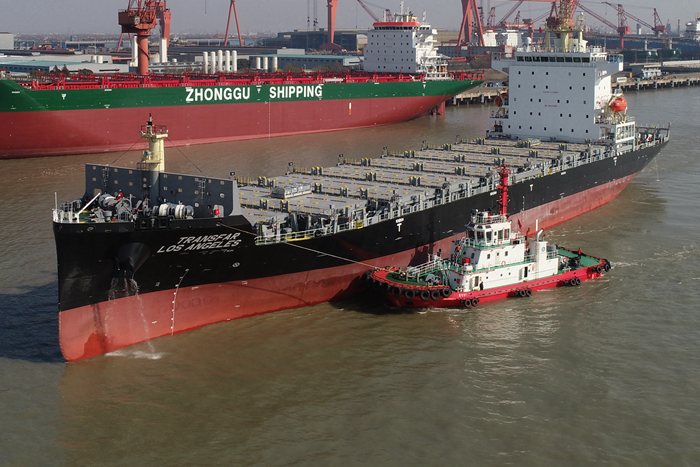 元月3日中午,由我集團(tuán)揚(yáng)子長博造船為致遠(yuǎn)航運(yùn)建造的1800TEU集裝箱船“TRANSFAR LOS ANGELES”輪,緩緩駛離船廠碼頭,開啟交付后的首航。這是揚(yáng)子江船業(yè)在新的一年,完工交付的首制船。拉響啟航的汽笛聲,新的一年,新的征程,讓我們昂首奮進(jìn),在2023年,共同開辟遠(yuǎn)航新篇章。