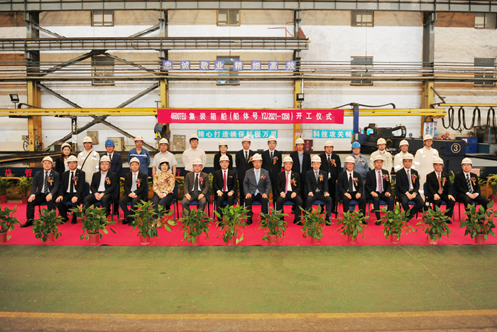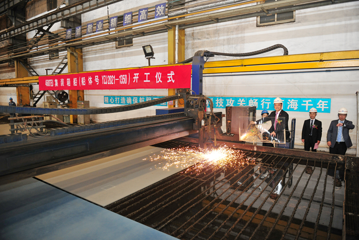 5月10日上午11時(shí)18分,隨著中谷海運(yùn)集團(tuán)夏國(guó)慶副總裁按下點(diǎn)火啟動(dòng)按鈕,我集團(tuán)承建的中谷物流10艘4600TEU集裝箱船在新?lián)P子造船加工車間順利開工。