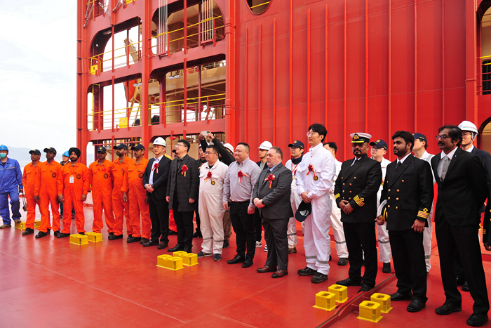 3月9日上午,新船命名人崔佳梅女士,地中海航運公司新造船中國區(qū)經(jīng)理CH Giuseppe Gargiulo先生,我集團總經(jīng)理助理兼揚子鑫福造船總經(jīng)理楊雪彥先生,以及來自DNV船級社、船東現(xiàn)場監(jiān)造組、船廠方相關(guān)部門的領(lǐng)導和嘉賓共同見證。崔佳梅女士將新船命名為“MSC IRINA”輪,為新船砍纜并擲香檳禮,拉響汽笛。CH Giuseppe Gargiulo先生與崔佳梅女士為新船送上寄語,祝福新船揚帆萬里,順風順水,平安啟歸,班班滿載,為各方帶來榮譽和財富。