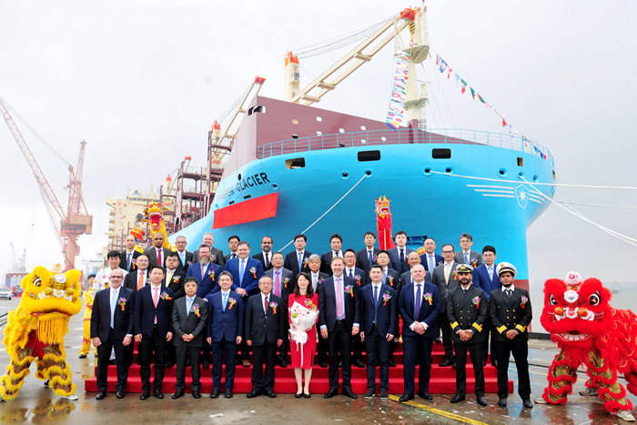 當日,我集團與LEPTA船東共同為新船舉行了隆重的命名儀式。命名人馬士基航運副總裁Peter Lund先生,教母中國農(nóng)業(yè)銀行江蘇分行國際部總經(jīng)理劉艷女士,三井物產(chǎn)株式會社東亞總監(jiān)濱田昭仁先生,中國船舶集團708所副所長朱建璋先生,美國船級社(ABS)中國地區(qū)副總裁Paul Karam先生,克拉克森航運經(jīng)紀公司董事周吉樑先生,以及我集團董事長任樂天先生,集團副總經(jīng)理宋書明先生、副總經(jīng)理杜成忠先生、副總經(jīng)理丁建文先生、副總經(jīng)理周科偉先生等領(lǐng)導(dǎo)和嘉賓共同出席了命名儀式。Peter Lund先生將新船命名為“MAERSKGLACIER”輪,劉艷女士為新船砍纜并擲香檳禮,拉響汽笛,祝福新船、隨船船員航行平安,為船東和租家?guī)順s譽和財富。